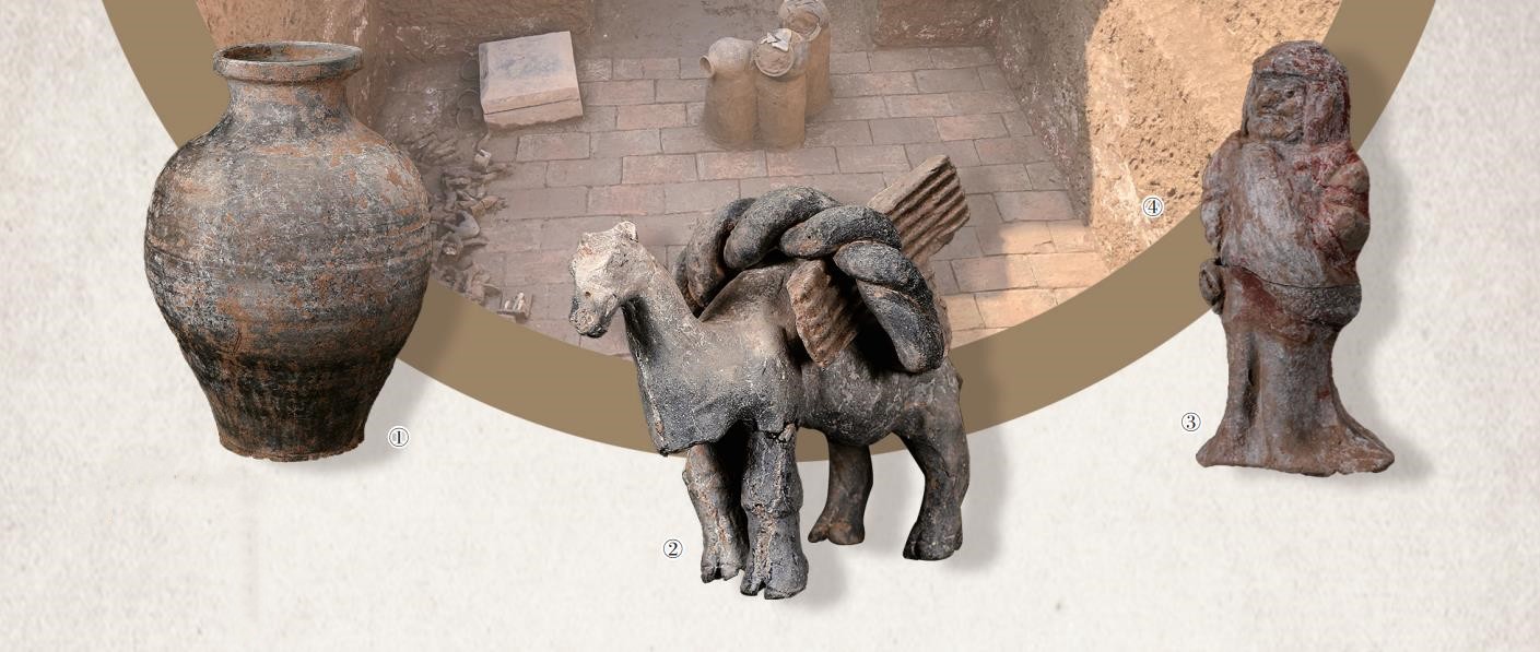 ①出土于北周宇文觉墓的陶罐(资料照片)。 ②出土于北周宇文觉墓的载物骆驼(资料照片)。 ③出土于北周宇文觉墓的持盾武士俑(资料照片)。 ④北周宇文觉墓M655墓室(资料照片)。 照片均为陕西省考古研究院供图